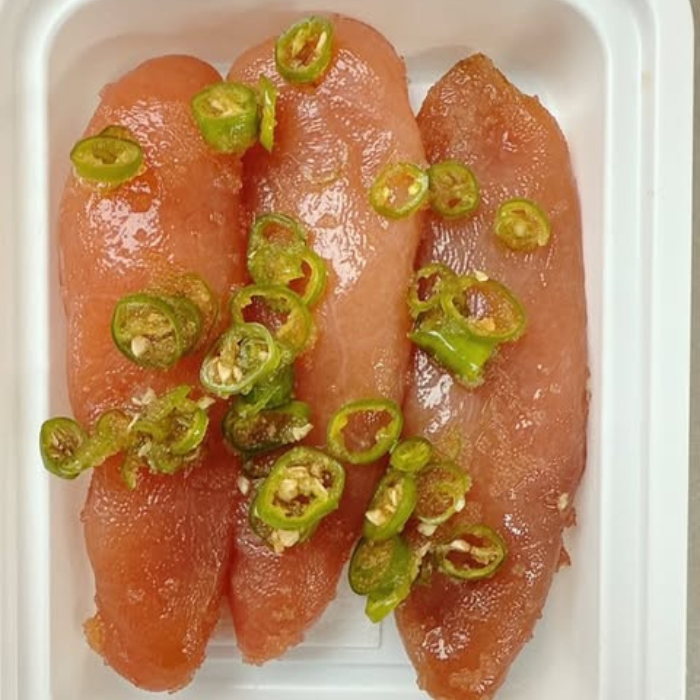 □原材料:助宗たら卵(北海道産)、日本酒、明太子調味料(米発酵調味料、魚介エキス、還元水飴、香辛料)、食塩、青唐辛子/調味料(アミノ酸等)、着色料(ベニコウジ)、(一部に大豆を含む)